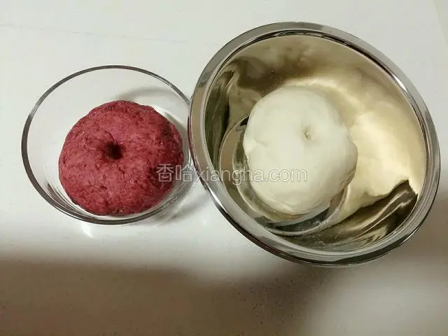 6.取剩余的200克面粉,红曲粉,倒入120mL的温水,按上面的方法进行和面。