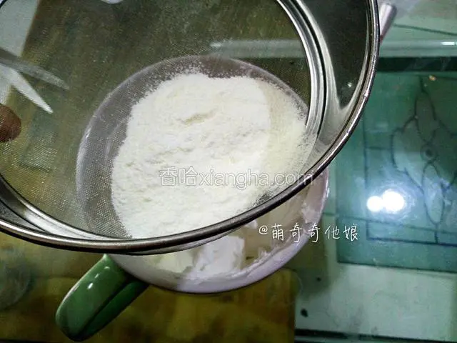 5.筛入玉米淀粉和奶粉,迅速翻拌均匀,动作要迅速,拌五六下到看不到粉类即可收手。