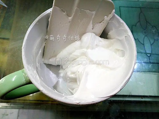 6.拌好的蛋白糊应该是非常浓稠坚挺的,如果像戚风蛋糕一样有点软了说明蛋白消泡了。