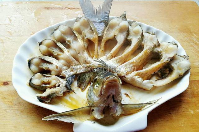 5.准备一贝壳盘,鱼头摆放在盘子的中间。鱼身依次摆好。