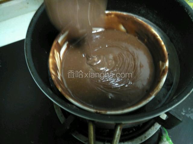 5.另一个锅同时隔热水融化巧克力,或者先融化好也可以。与奶油吉利丁液拌匀