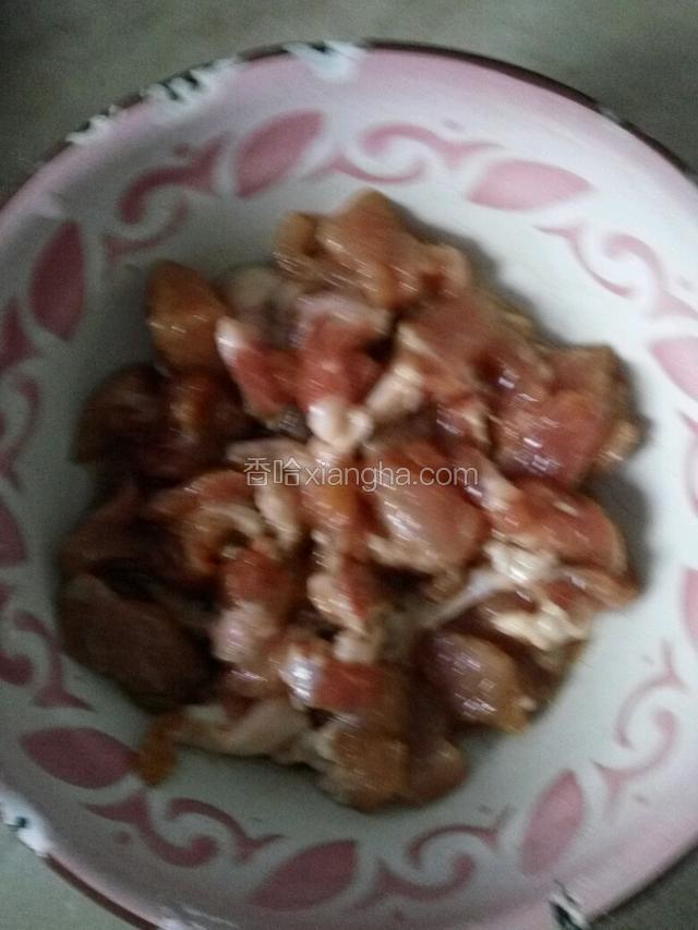 4.把瘦肉切丁,用油,盐,酱油,生粉腌制好