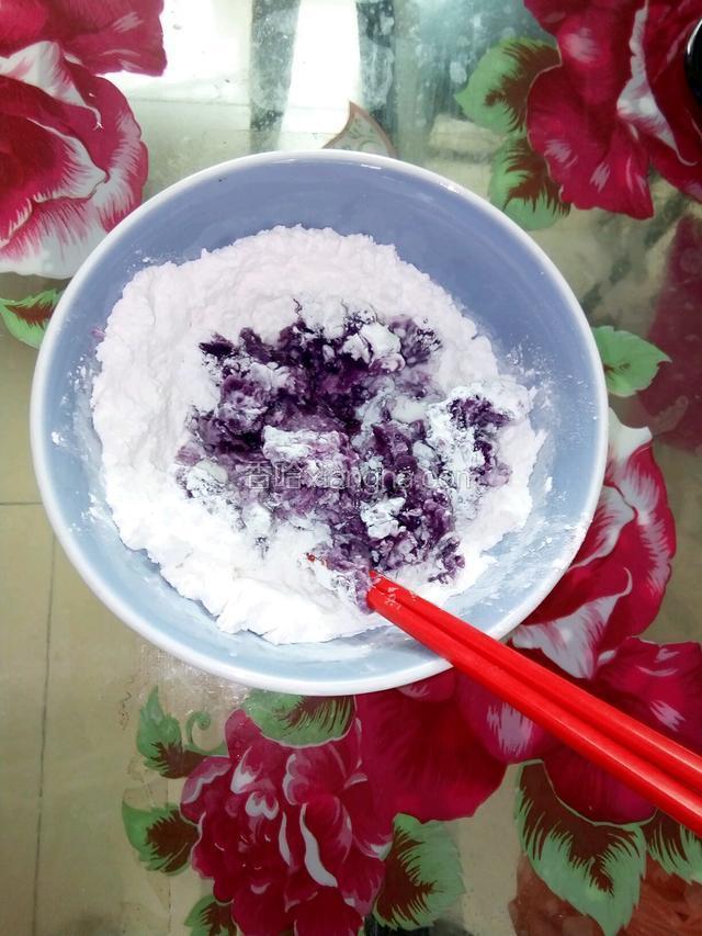 1.紫薯隔水蒸熟后,加入白糖,趁热用勺子压成泥状。(这样可以让紫薯甜一点。)