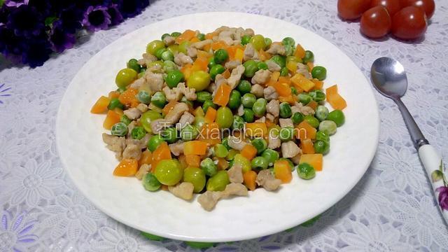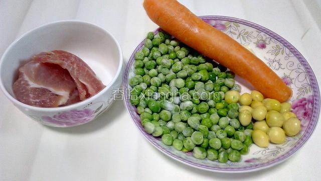 4.把豌豆丁、胡萝卜丁、白果放入沸水中焯煮1分钟。