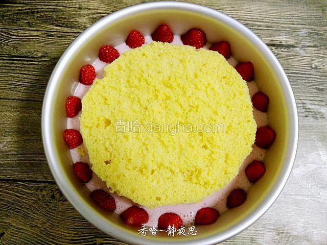 18.倒入一半的慕斯糊,盖上蛋糕坯即可,此时在中间铺上之前切碎的草莓丁,此步骤忘记拍照