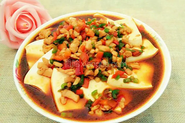 1.嫩豆腐冲洗一下切片,摆入盘中,入蒸锅蒸大约六、七分钟