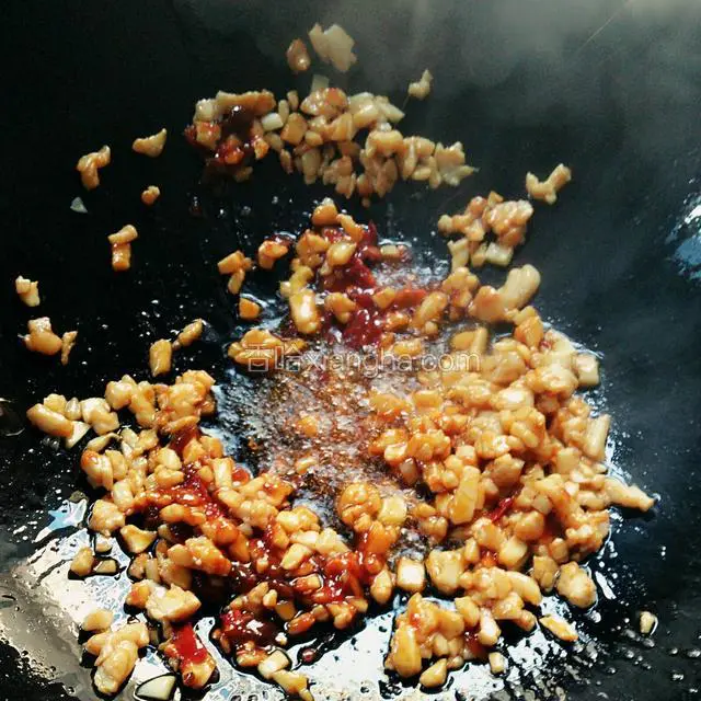 5.倒入肉末煸炒至变色