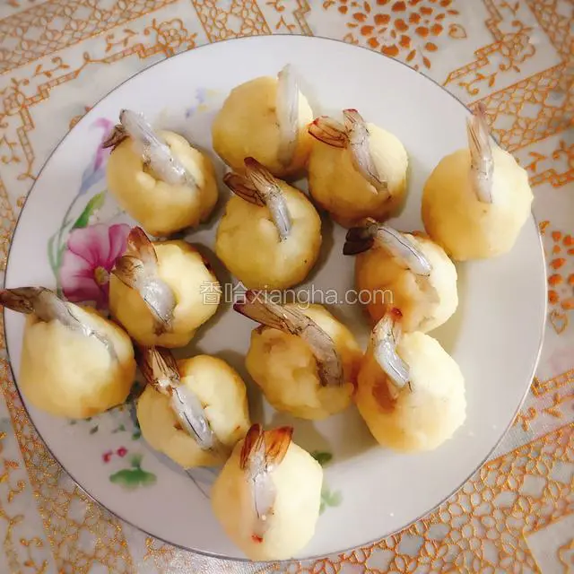 2.土豆去皮用锅煮一下,碾成泥,在土豆泥中加入盐等调味料,取小部分压成饼状,把腌好的大虾放在上面,留虾尾在外面,团成球。