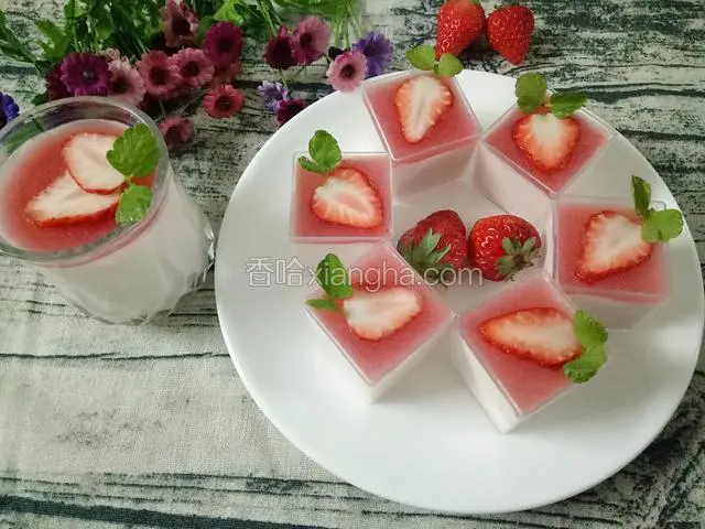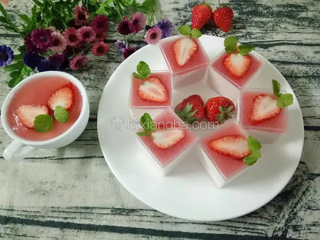 5.吉利丁粉倒入草莓泥中快速混合搅拌均匀。(留两勺草莓泥做镜面)