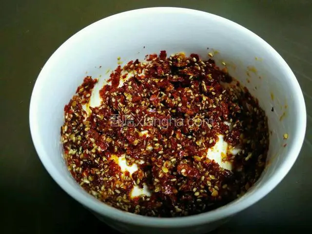 4.找一个耐热的大碗,将辣椒粉,花椒粉和白芝麻放入里面。
