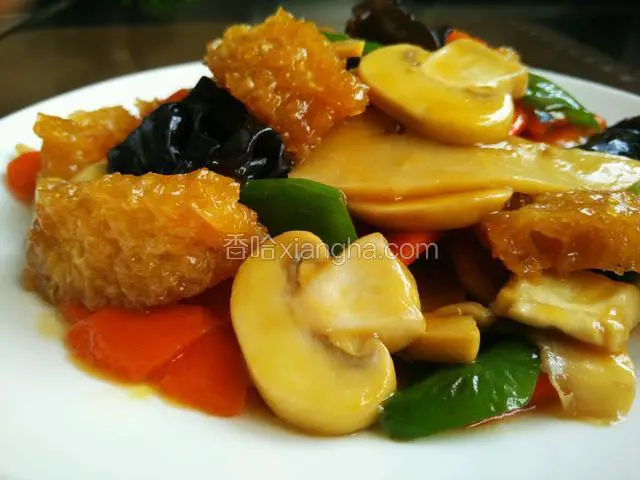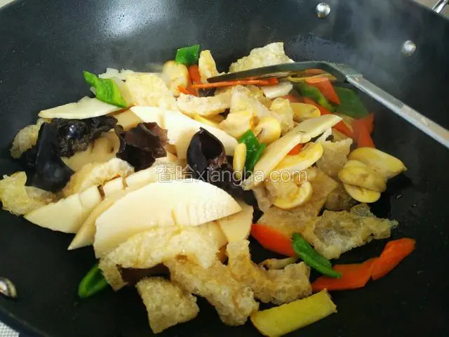 2.皮肚和木耳事先泡发好,皮肚切成小块儿,笋切片儿。