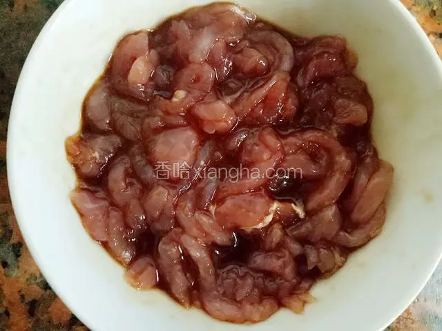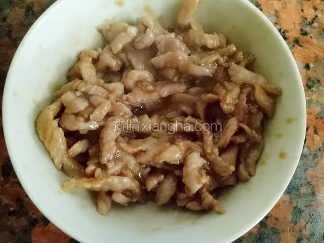3.里脊肉切丝,加入少许水淀粉、料酒、生抽放置10分钟