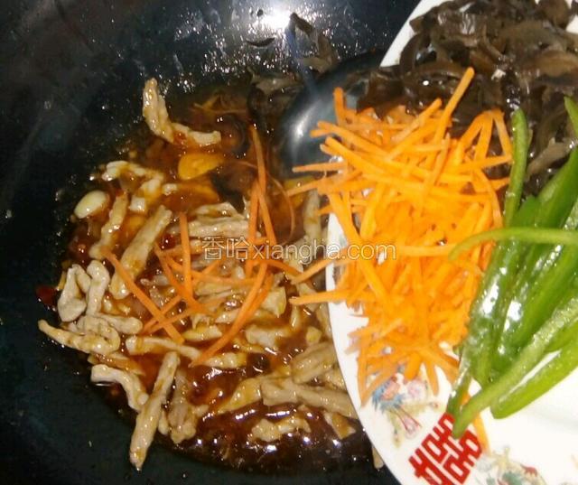 2.分别将里脊肉、胡萝卜、木耳、尖椒、姜切成细丝,小洋葱切末,大蒜切片。