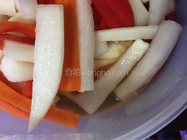 3.将萝卜条放入无油的干净容器中,加入少量的盐,腌制一小时左右,腌出萝卜中的水分
