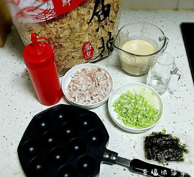 1.准备好食材。由于当天没有买到章鱼就买了一条鱿鱼,洗净后焯完水,切成小块。120克章鱼烧粉中打入两个鸡蛋,加少量的清水慢慢搅拌,搅拌到没有结块的时候,再倒入剩余的清水搅拌成面糊,拌好的面糊倒入有缺口的壶中,方便下面操作。即食海苔剪成碎条。洋葱和卷心菜剁碎。