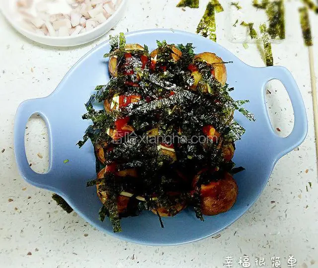3.每个小窝窝里都撒上几粒鱿鱼粒。