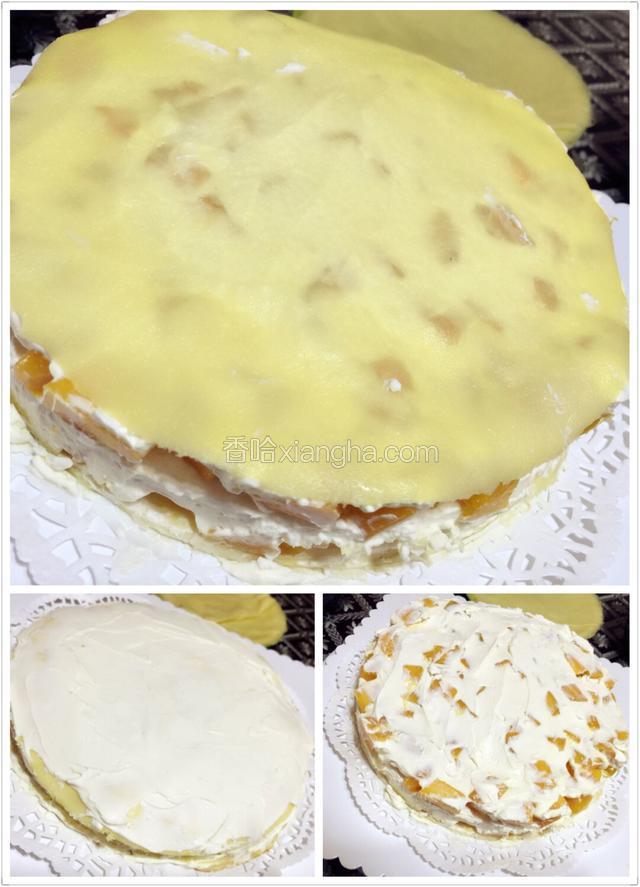 6.最底下铺一层饼皮,然后一层奶油抹平,然后再一层饼皮,如此反复,每隔三层饼皮夹一层芒果