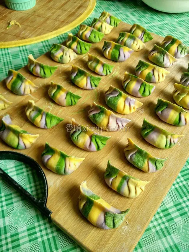 5.紫甘蓝汁,菠菜汁,南瓜泥分别各加入200克面粉和少许的盐和成面团。盖上保鲜膜醒15分钟