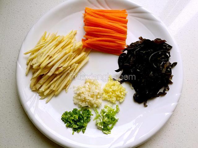 5.胡萝卜去皮后切丝,冬笋和木耳也切成丝,葱,姜,蒜切未备用。