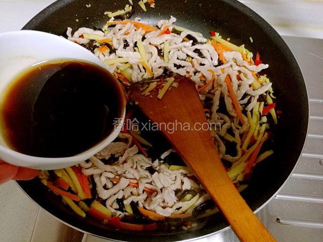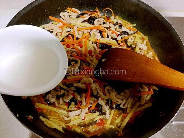 3.1茶匙干淀粉加一点水搅成水淀粉,加入肉丝中用手抓捏到全部被吸收。