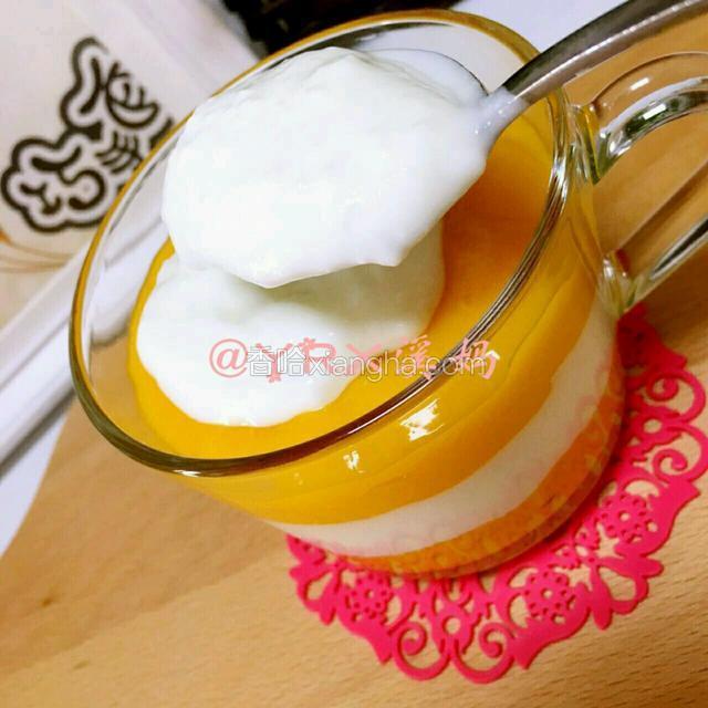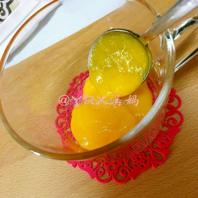 3.透明玻璃杯子杯底先铺一层芒果泥