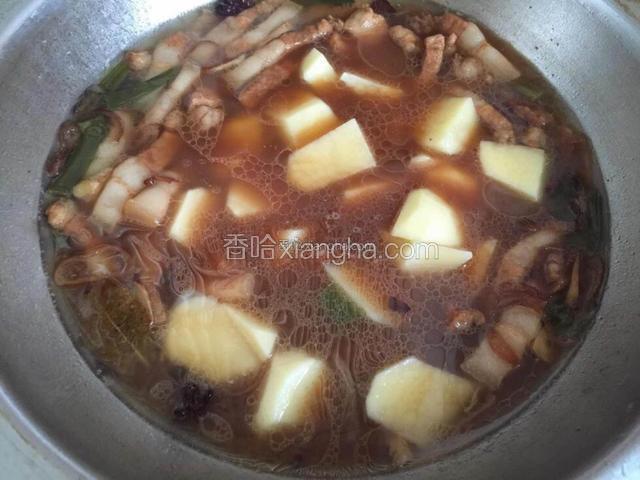 6.汤收到一半时放入土豆块和盐继续炖煮至土豆熟烂,汤汁收浓。