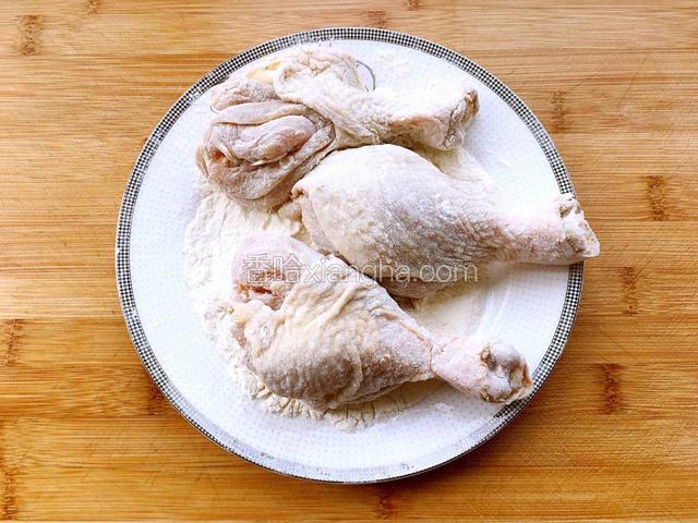 6.备一个盘子放适量干面粉,把鸡腿表面粘上干面粉