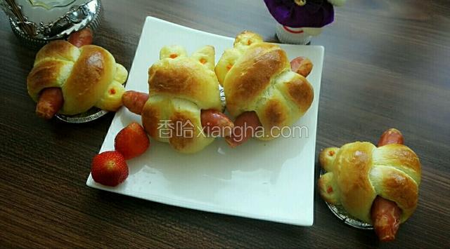 6.如图卷上热狗肠,再次发酵,表面刷全蛋液