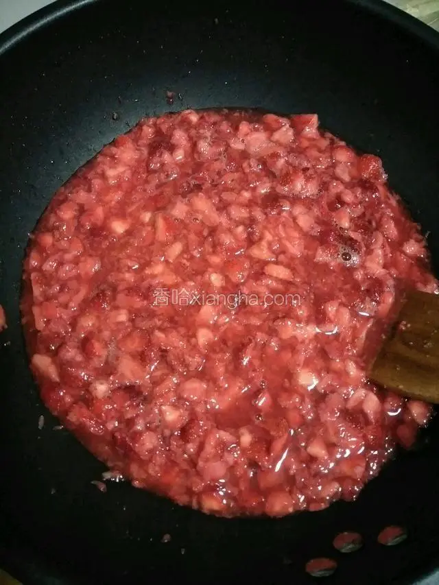 3.把草莓连汁一起倒入不粘锅大锅煮开