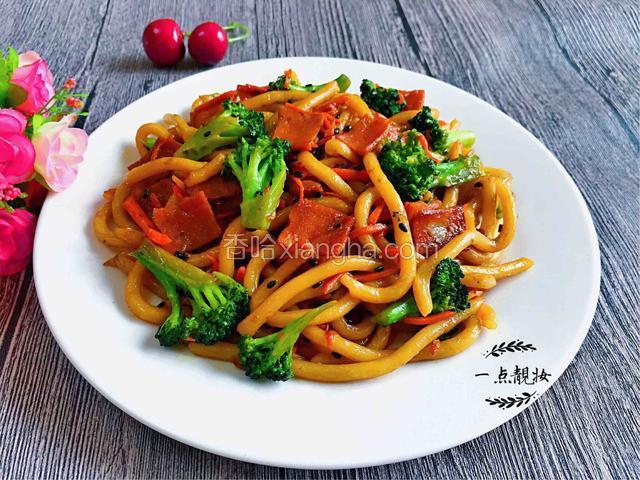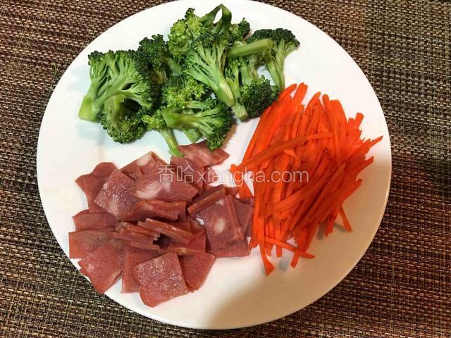 1.西兰花洗净切成小朵,胡萝卜去皮洗净切成丝,培根切成小块