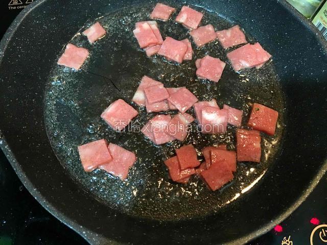4.平底锅中放入少许油,下入培根小火煎出部分油脂