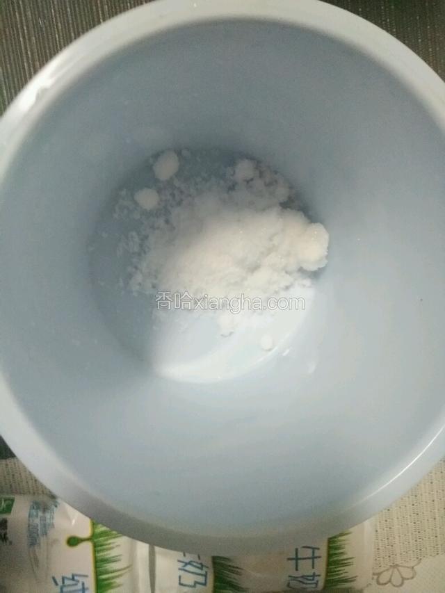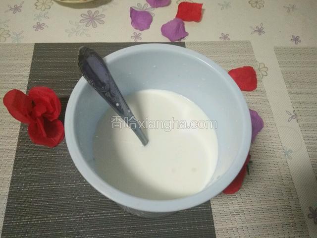 6.将酸奶发酵剂放入,用匙子搅拌均匀。