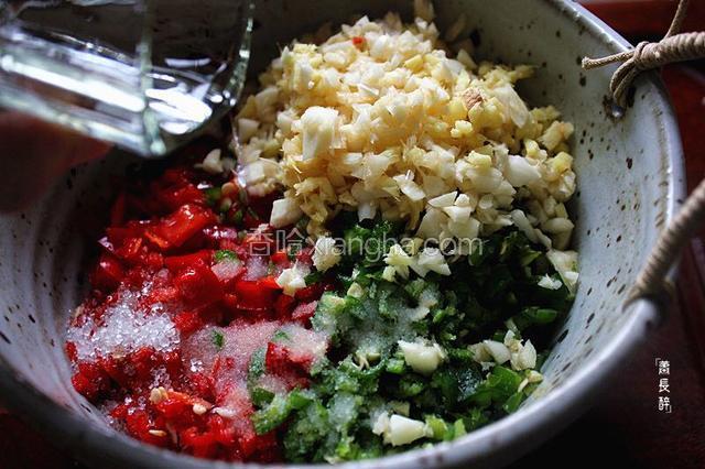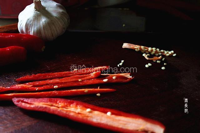 3.辣椒去蒂,切成细丝,辣筋和辣椒籽保留多少决定成品的辣度。