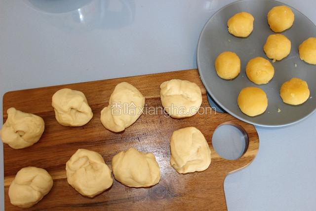 6.将面团擀扁,包上绿豆沙馅,捏紧收口处
