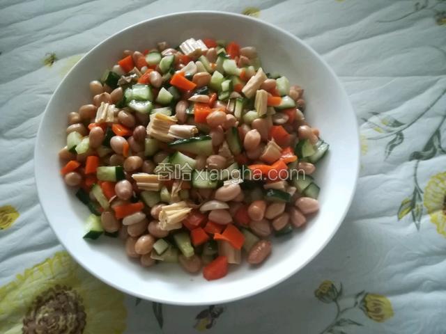 3.黄瓜,胡萝卜,腐竹,切丁。如图!