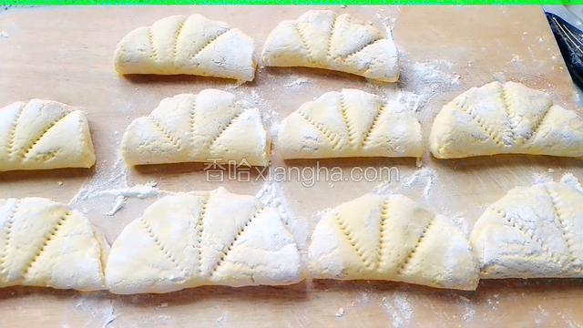 6.案板撒上面粉。面团放案板上多揉几下,排气。搓成长条,切成一个个小剂。