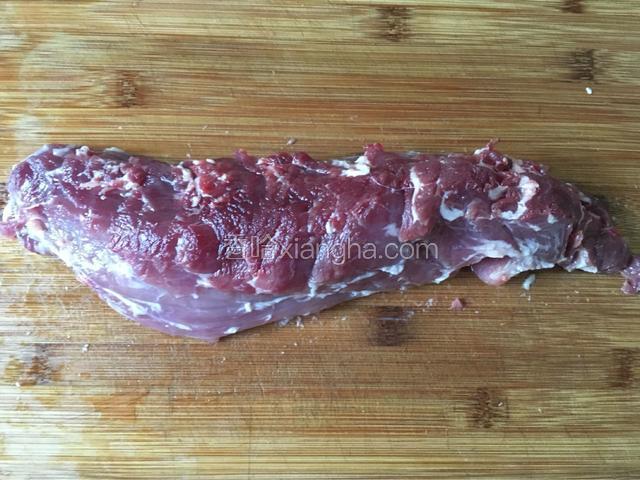 1.里脊肉用菜刀剃去筋膜。
