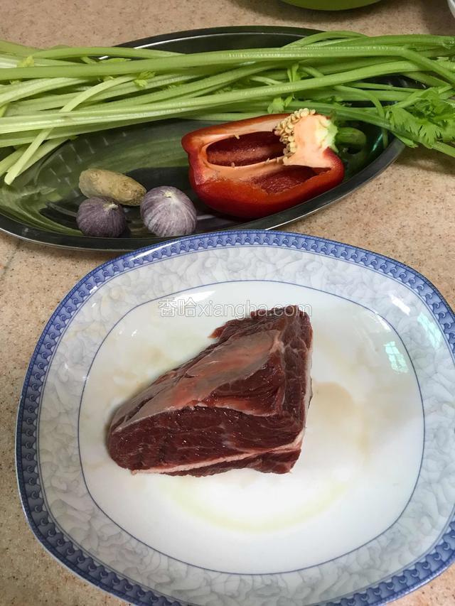 2.芹菜去叶切碎、红椒切细粒、牛肉剁碎,姜蒜切细和生抽、油、白胡椒粉、生粉一起放入牛肉中