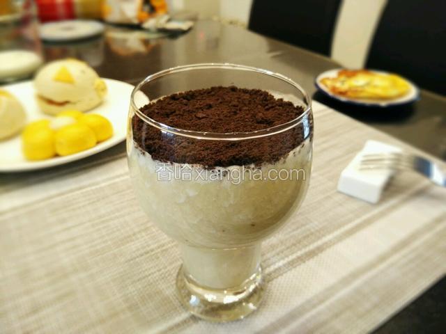 5.倒入杯中,上面铺一层奥利奥饼干碎,如果饼干碎不够细的话,可以事先用擀面杖将它碾碎。