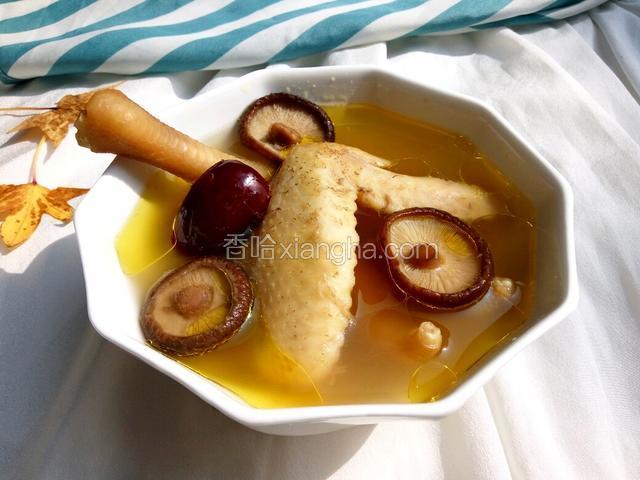 4.把老母鸡、香菇干、红枣、茯苓、姜、放入电饭锅内、加入适量清水