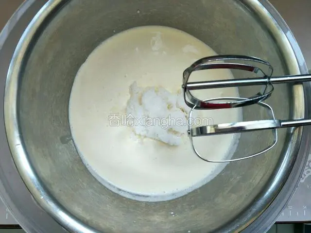 5.淡奶油和糖一同放入干净盆中,隔冰袋用电动打蛋器低速打发。