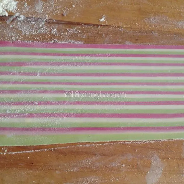 2.三种颜色的面团和好,白色面团和面的时候放盐少许,这样做出的面条比较有韧性,不易煮烂,吃起来也筋道,另外两种面粉直接用菜汁和好就行,由于天气热,我和的面团都比较硬,和好后用保鲜膜包好放置二十分钟左右醒面