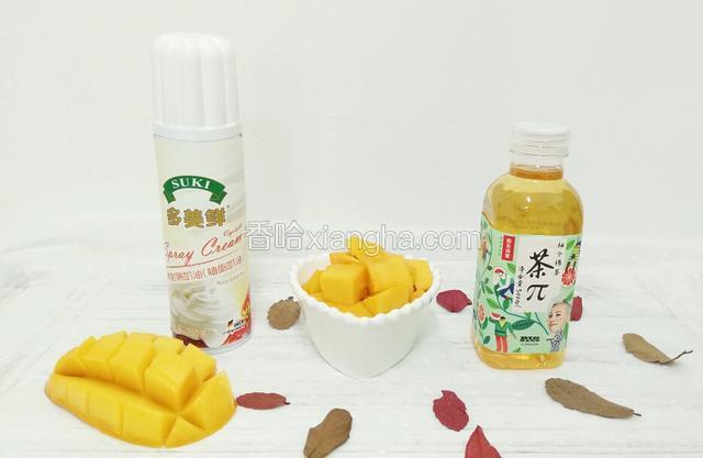 1.先来做芒果绿茶奶盖,准备一瓶比较清淡的柚子绿茶,不要太甜,以免盖住芒果的香味,芒果切块。
