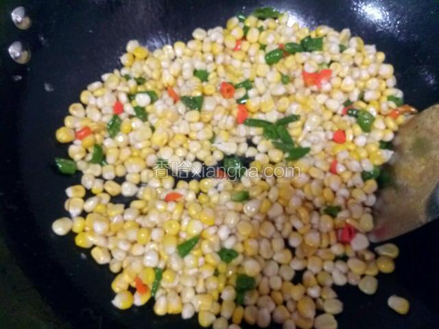 6.放入玉米粒翻炒均匀。玉米粒变色熟后放适量盐鸡精调好味即可。