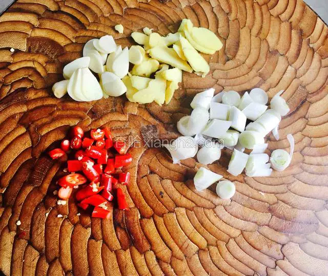 6.准备好葱姜蒜和红米椒一起洗净,干红辣椒剪成小段,准备好花椒粒和熟白芝麻。