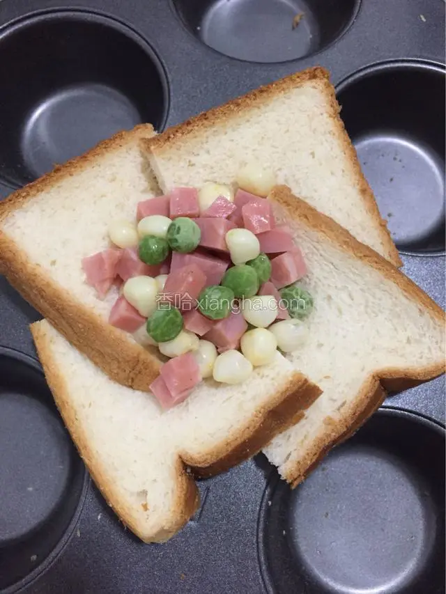 4.火腿切丁后和玉米粒青豆一同放入吐司中