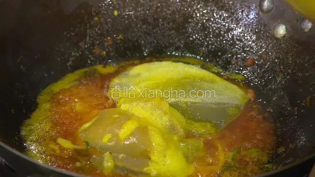 1.先将煮熟的蟹黄剥出,下入油锅小火煸炒,炒制翻砂的状态加料酒去腥提味。