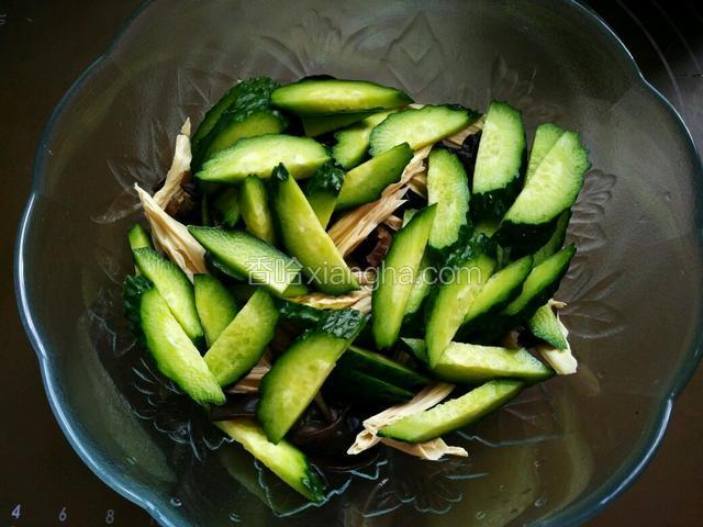 4.再放入黄瓜片,这次黄瓜片我特意切的厚一点,因为是给女儿送饭,不想时间久了,黄瓜蔫出水就不好吃了,如果现拌现吃,可以切薄一点。
