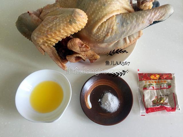 2.鸡去内脏和鸡屁股,洗净,放入盆中,在鸡身上用牙签扎一些孔,放入盐焗鸡粉和盐,涂满鸡的全身。