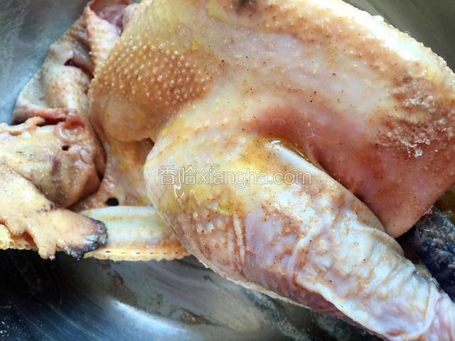 3.倒入料油,裹满鸡的全身。